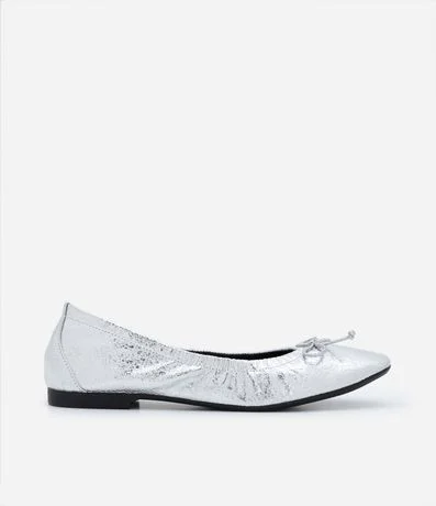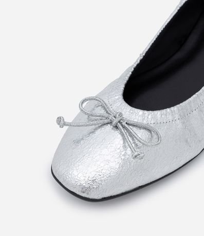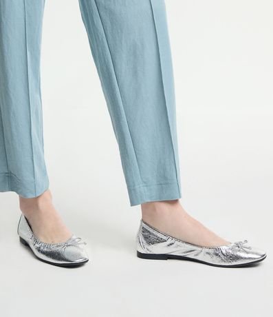 Ref: Sapatilha feminina clássica metalizada com bico quadrado, abertura elástica, laço aplicado no cabedal e efeito craquelado.