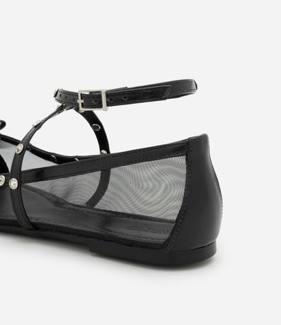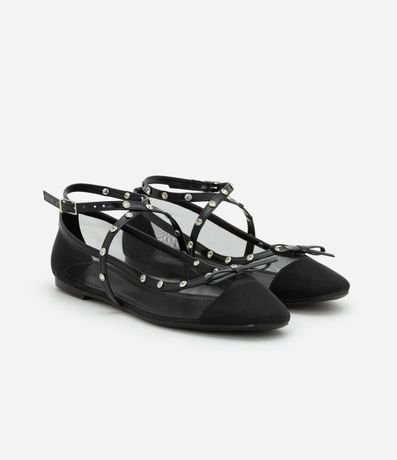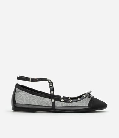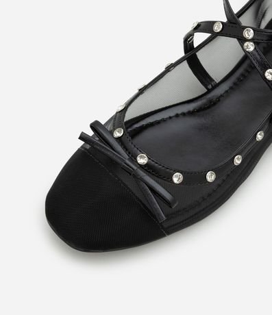 Ref: Rasteira feminina confeccionada com tecido tela nas laterais, bico redondo, lacinho aplicado na frente, strass em todos os viés, tiras finas sobrepostas e fechamento por fivela lateral.