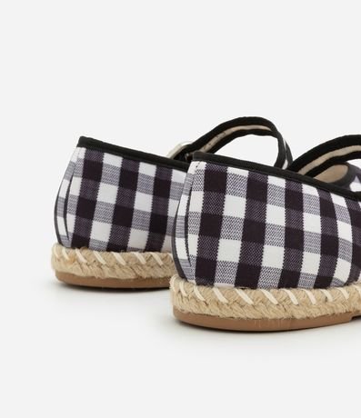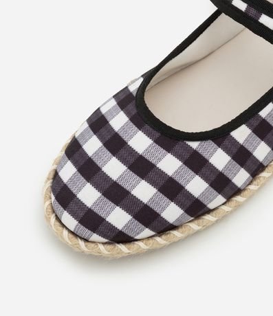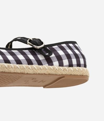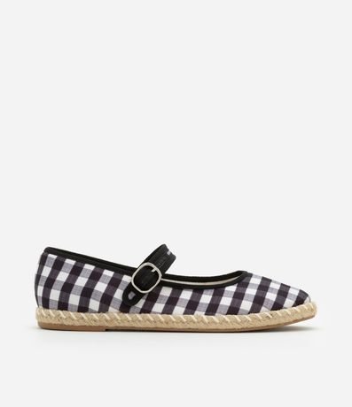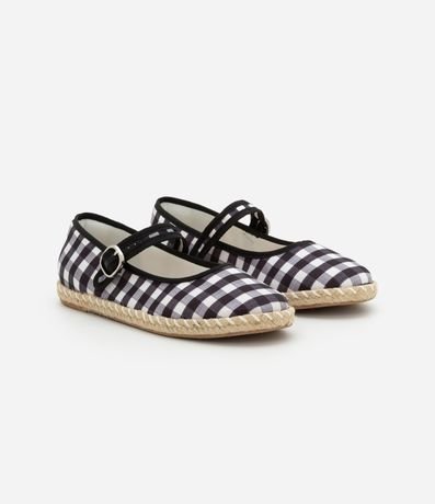 Ref: Sapatilha de bico redondo, confeccionada em algodão, com salto rasteiro com detalhes de cordinhas contrastantes e estampa xadrez. Peça com tira com fivela para fechamento. Salto de 01 centímetro.