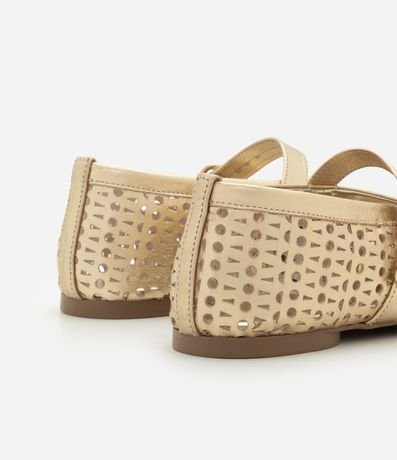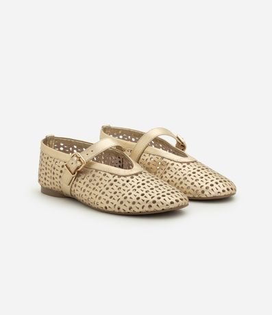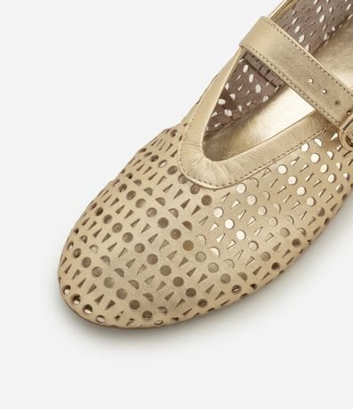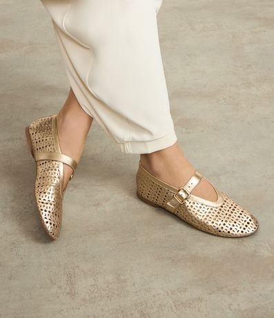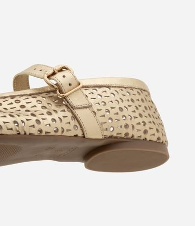 Ref: Sapatilha feminina confeccionada em couro com bico redondo, tira larga com fivela lateral e laser cut.