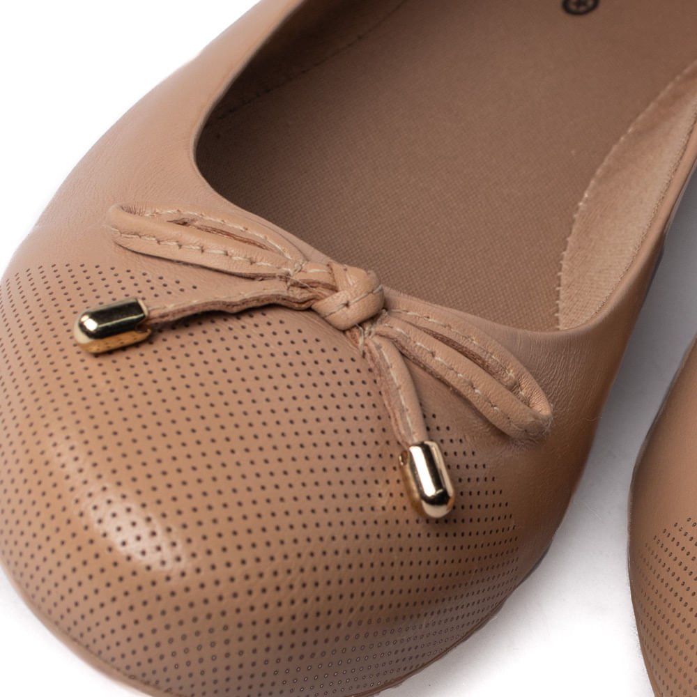 Ref: Confeccionada em couro atanado, conhecido por sua durabilidade e resistência, essa sapatilha apresenta um acabamento macio e visual sofisticado. O cabedal tem microfuros no bico e um delicado laço aplicado na parte superior, adicionando charme e feminilidade ao design.