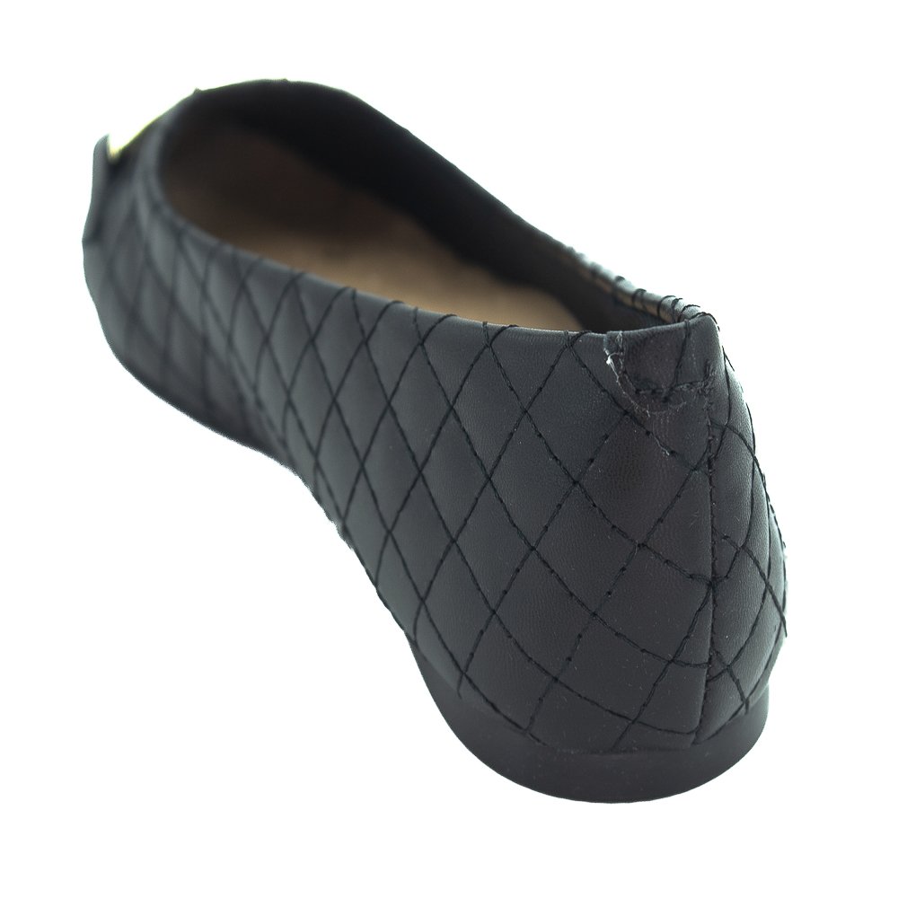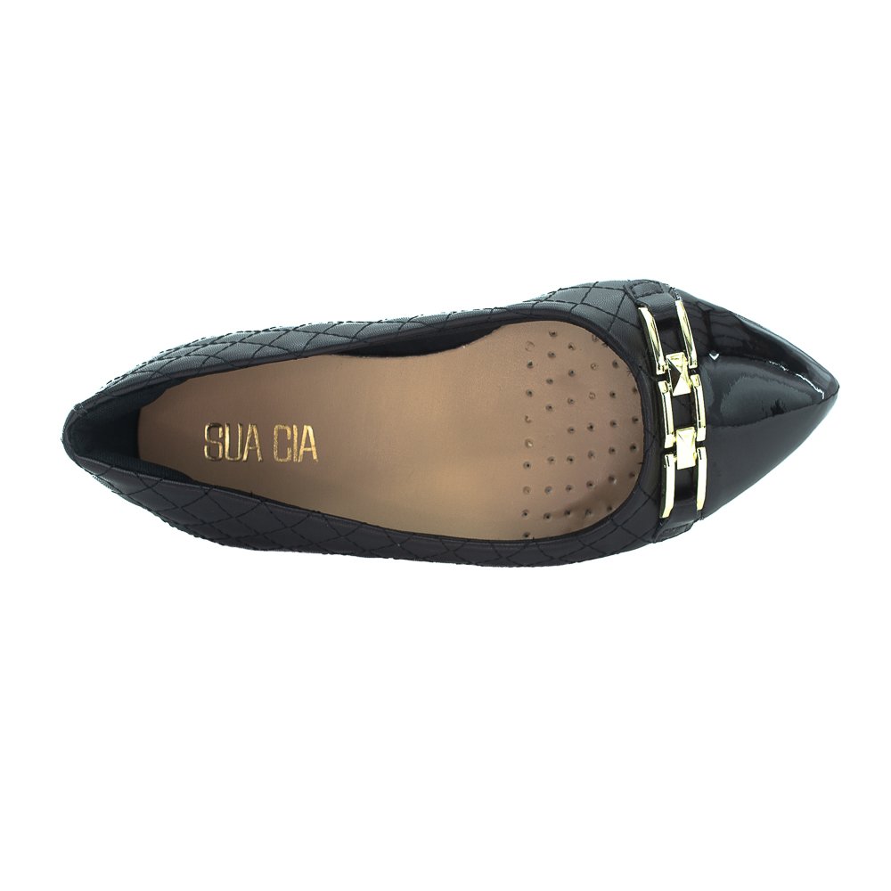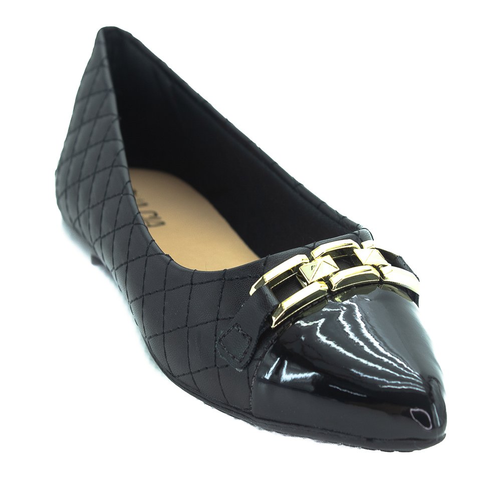 Ref: Esta elegante sapatilha preta combina sofisticação e estilo moderno em cada detalhe. Seu acabamento em matelassê adiciona textura e charme ao design clássico, enquanto a ponteira em verniz brilhante oferece um toque de luxo. O destaque fica por conta do ornamento dourado duplo, que transmite um ar de requinte e poder. Ideal para quem deseja unir conforto e glamour, este modelo é perfeito para transitar do escritório ao happy hour com muita personalidade.