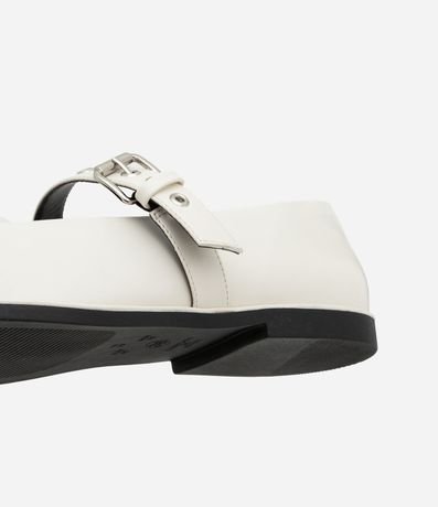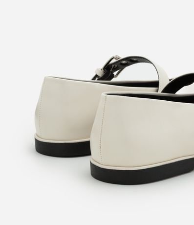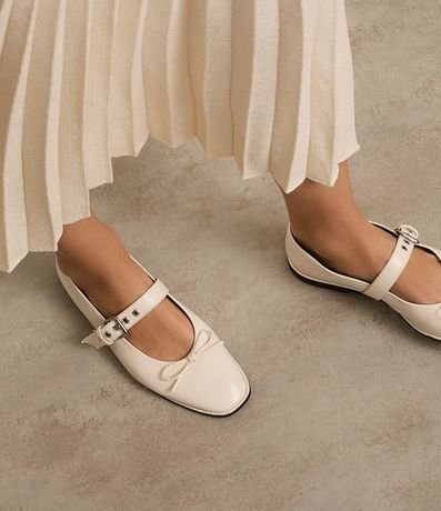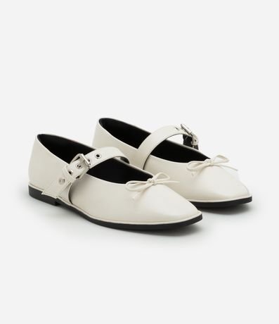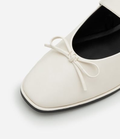 Ref: Sapatilha feminina confeccionada em material sintético com bico redondo, fechamento frontal com tira média, ilhós e fivela, peça com detalhe foto de lacinho frontal.