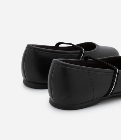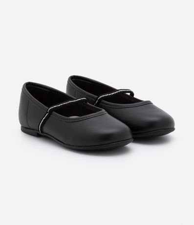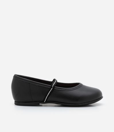 Sapatilha infantil confeccionada em material sintético, com bico redondo, salto rasteiro e detalhe de tirinha brilhosa.