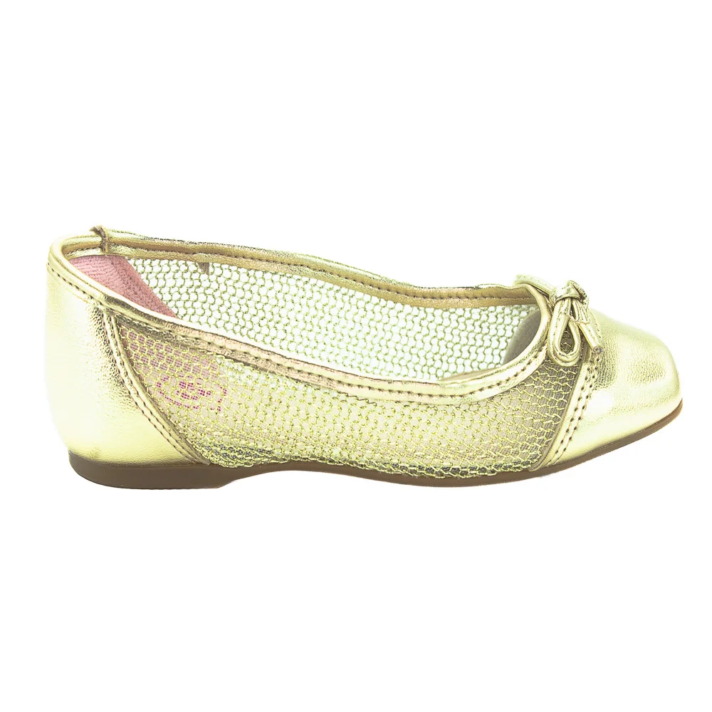 Ref: Um toque de brilho e delicadeza para os pés das meninas! Esta linda sapatilha infantil dourada combina sofisticação com conforto, sendo ideal para ocasiões especiais ou para dar um toque fashion ao look do dia a dia.Seu acabamento em material metálico com textura trançada nas laterais traz um visual moderno e glamouroso. O laço delicado no cabedal adiciona charme, enquanto o interior macio garante conforto durante todo o uso.