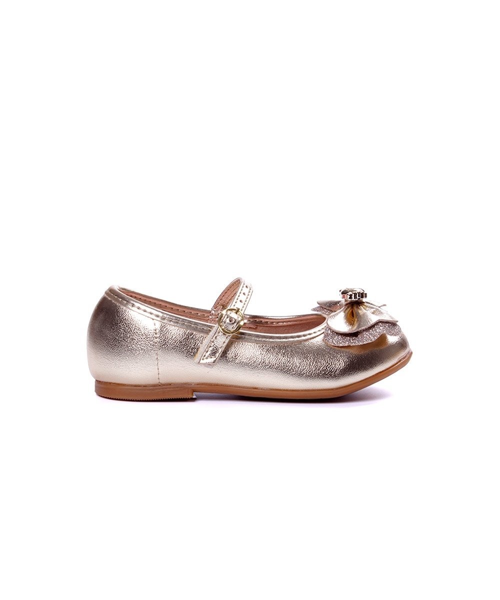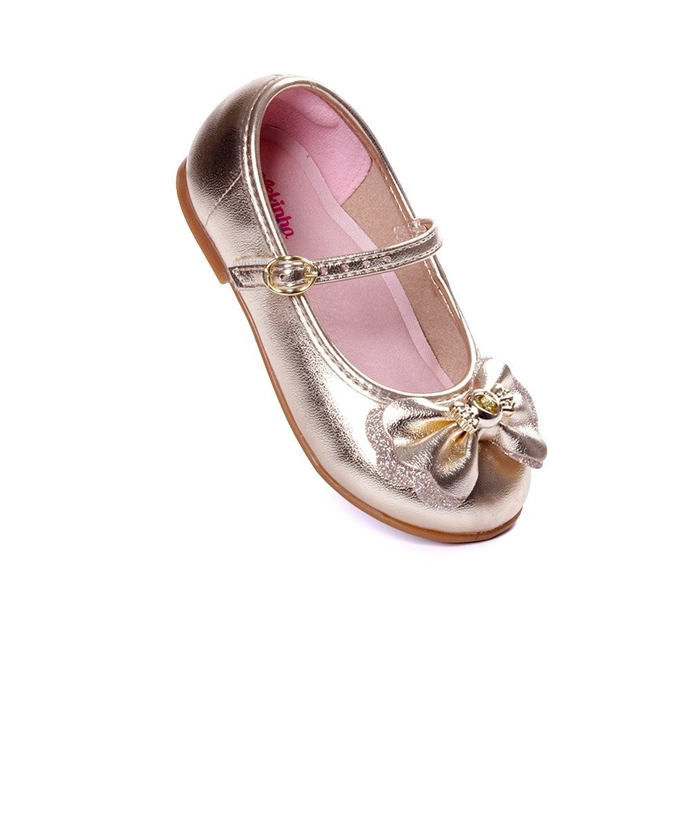 Seu cabedal com cor metalizada traz um toque sofisticado, enquanto o laço com brilho na parte frontal adiciona charme ao modelo.