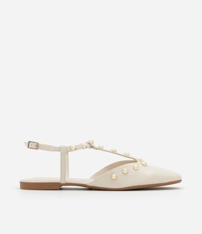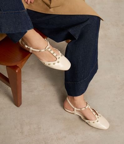 Ref: Sapatilha feminina confeccionada em material sintético, peça no modelo salomé com bico fino, aplicação de esferas, tiras finas e fivela lateral.
