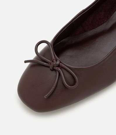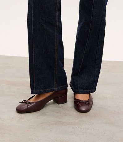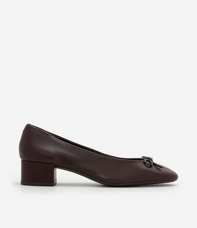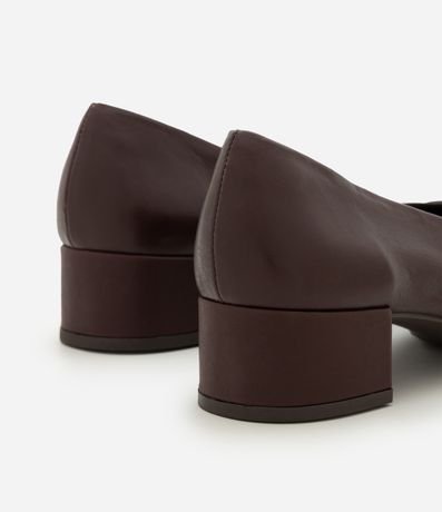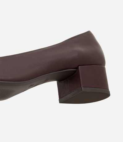 Sapato feminino em couro, estilo boneca, com bico arredondado, mini laço aplicado no cabedal e salto bloco de altura média.