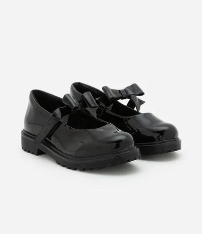 Sapato infantil de modelo boneca, confeccionado em material sintético com textura envernizada proporcionando brilho e glamour. Possui sola tratorada, fechamento por velcro e detalhe de lacinho na parte superior.