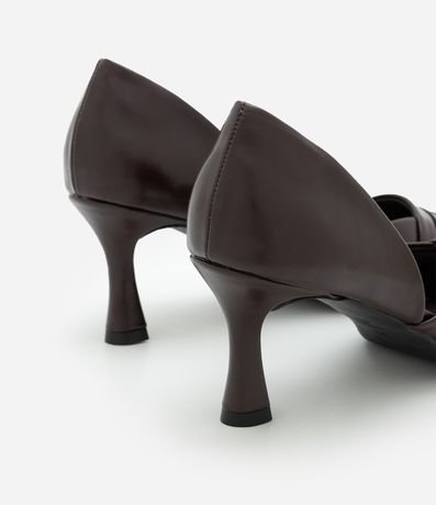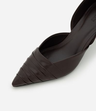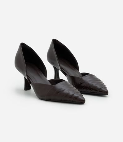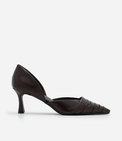 Sapato feminino confeccionado em PU. Possui design de scarpin com recorte lateral aberto, bico fino, pregas frontais marcadas e salto médio fino. Peça ideal para produções elegantes com conforto.