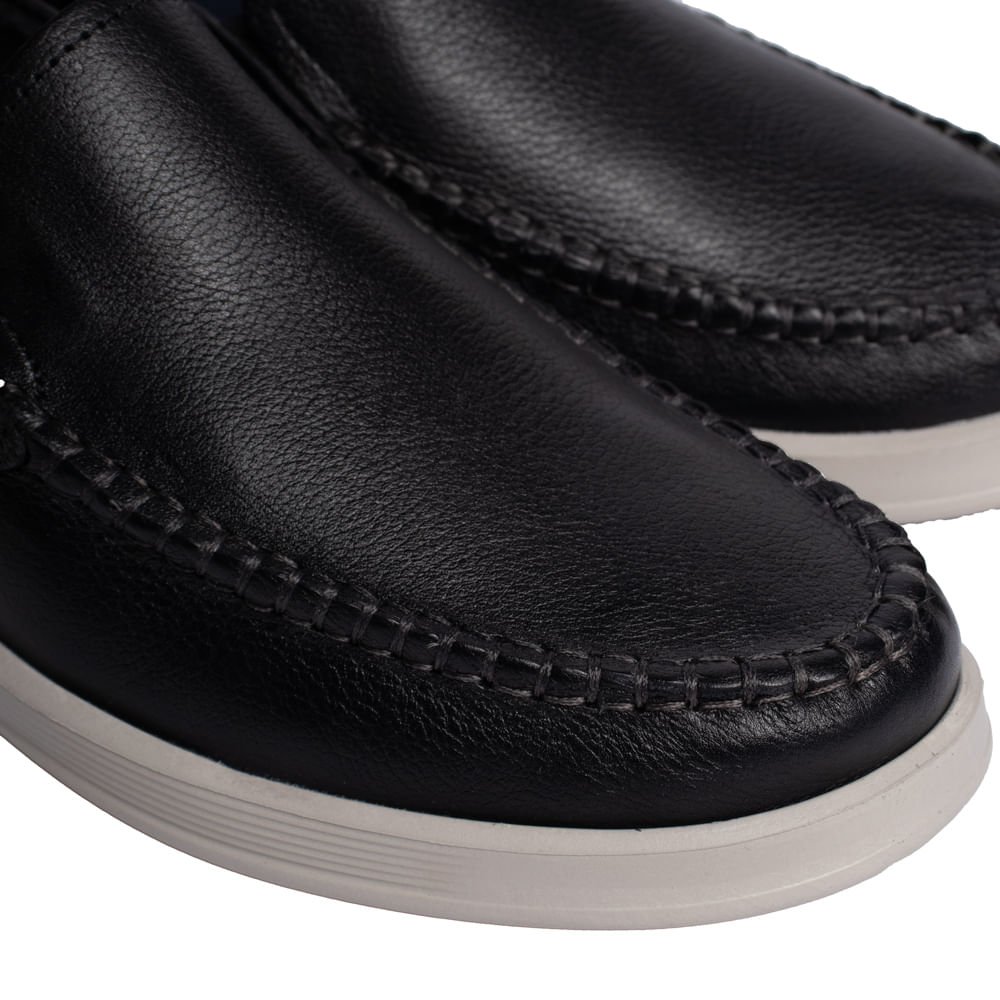 Confeccionado em couro legítimo, apresenta cabedal com frisos característicos e recorte em marrom na parte posterior, que acrescenta um toque de estilo ao design predominantemente preto. A palmilha em EVA macio com tecnologia Levitech proporciona amortecimento e bem-estar, enquanto o solado em PVC leve e flexível com pequenos sulcos arredondados favorece estabilidade e conforto a cada passo.