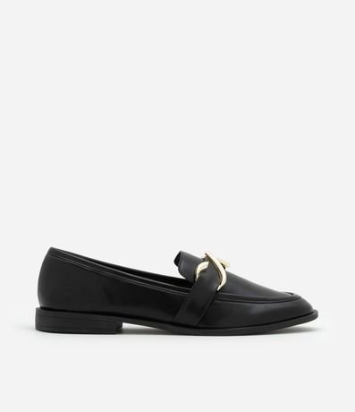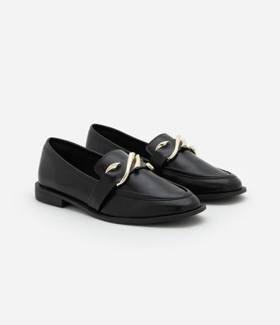 Sapato feminino confeccionado em material sintético com bico redondo. Peça no modelo mocassim com detalhe trançado contrastante.