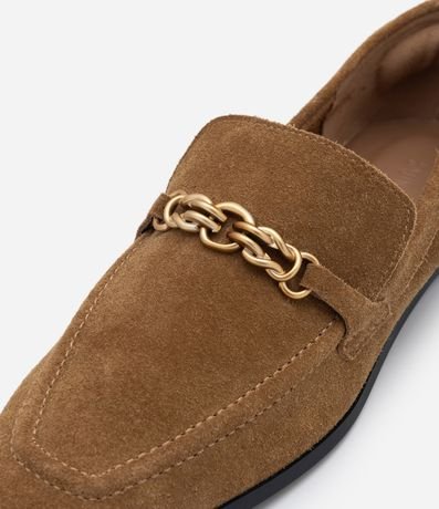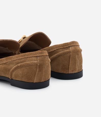 Ref: Mocassim feminino em camurça, com textura, salto baixo e detalhe de bridão metálico no cabedal.