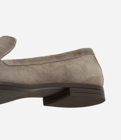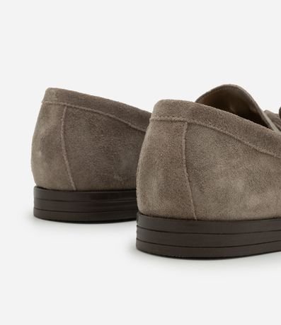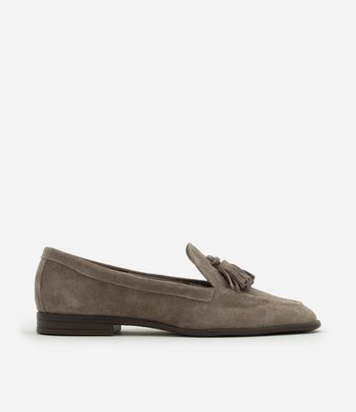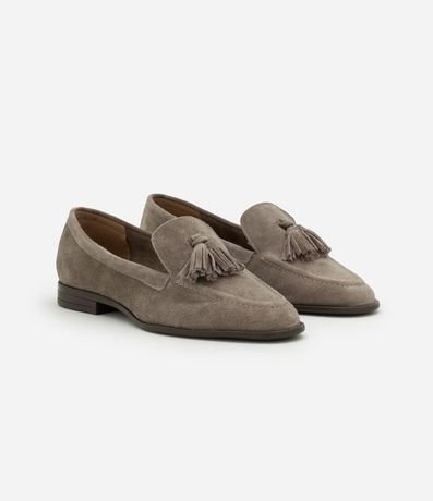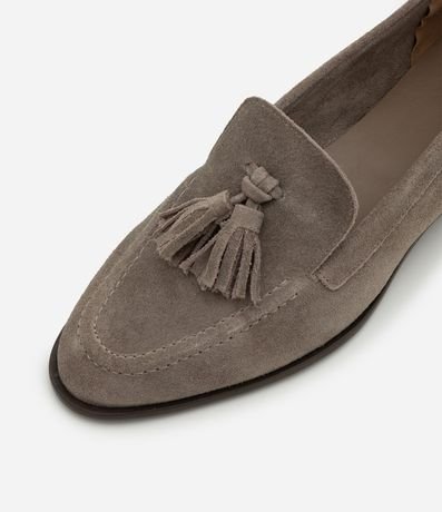Ref: Sapato feminino confeccionado em camurça de couro com bico redondo, franja e salto baixo, no modelo mocassim.