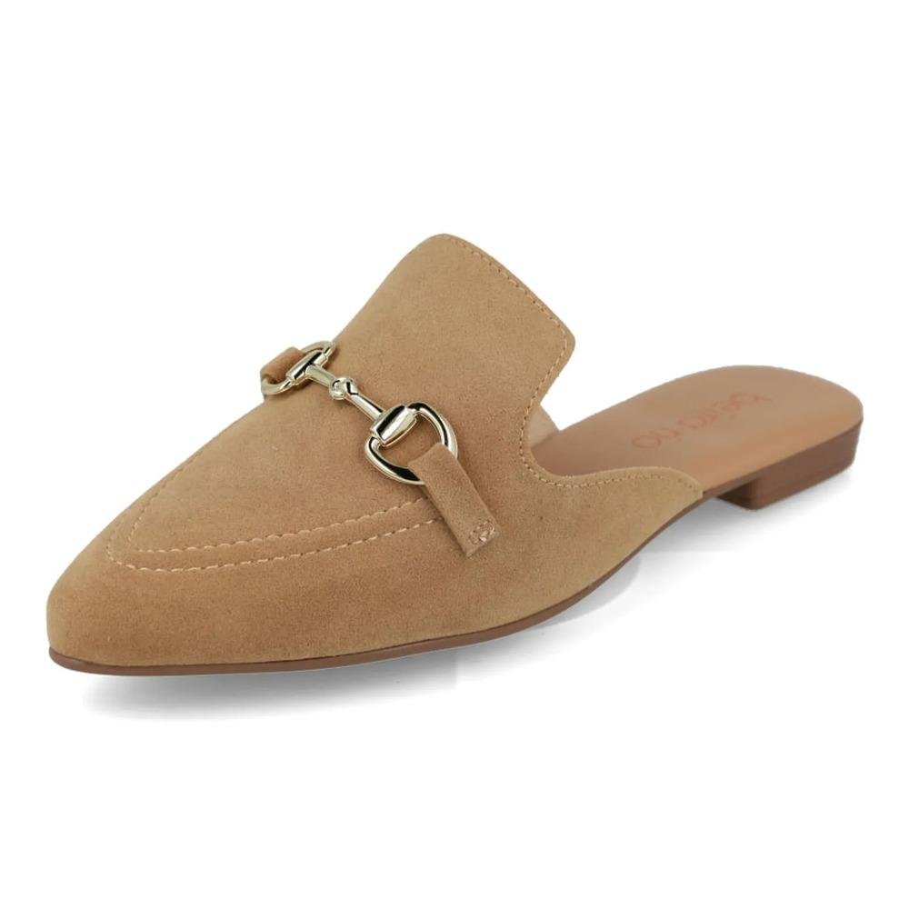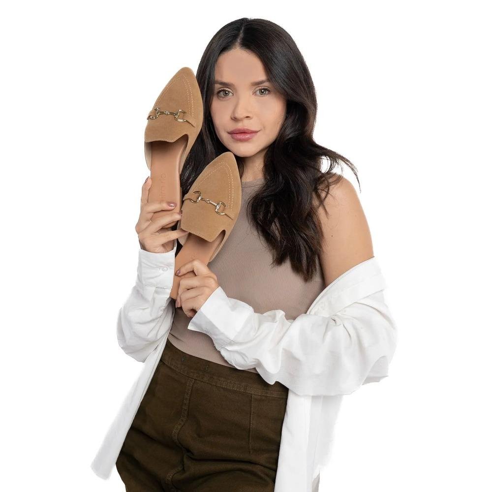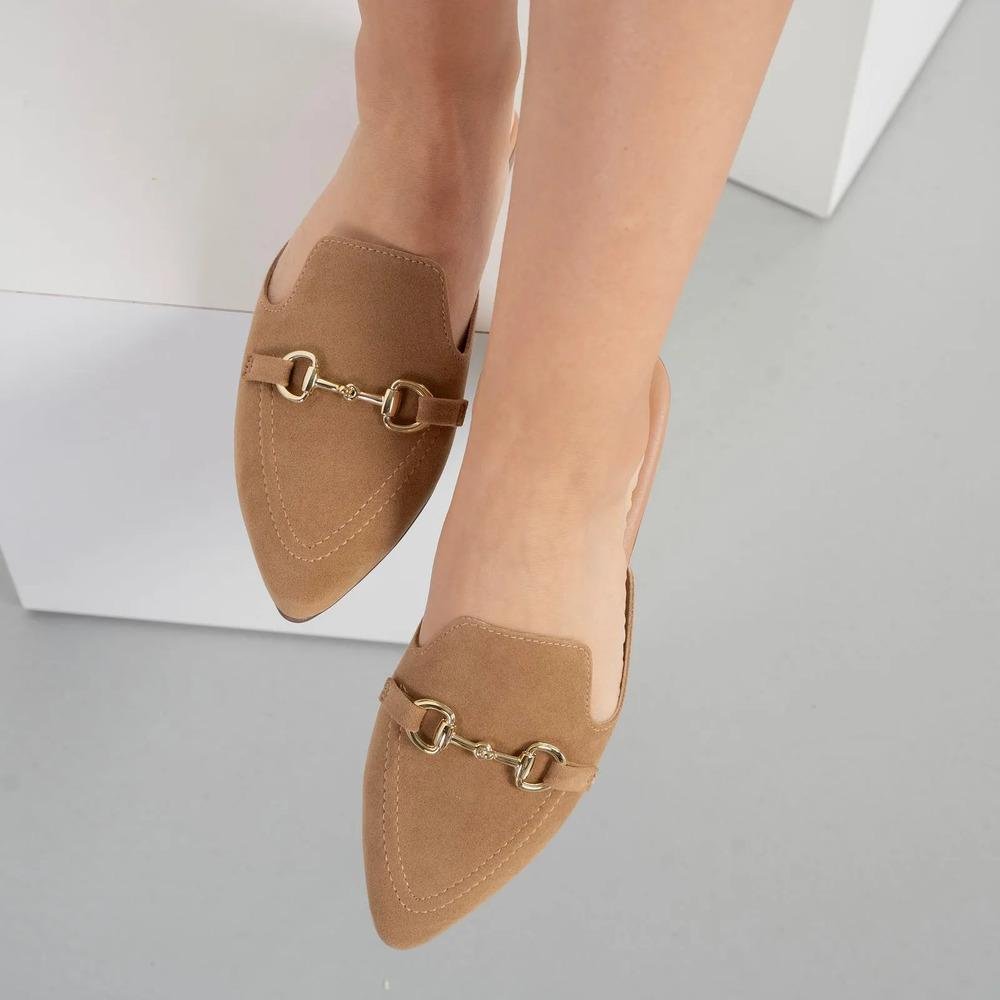 Detalhes AdicionaisDesign aberto atrás (mule), bico levemente alongado, enfeite de bridão metálico no cabedal