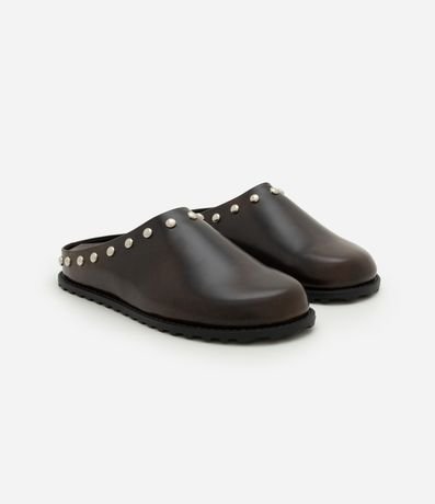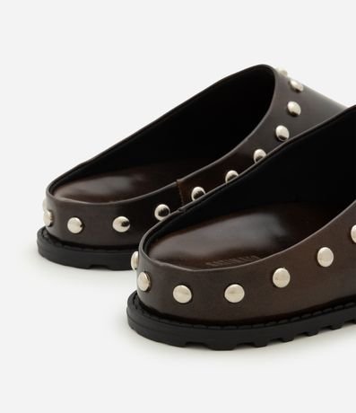 Sapato feminino estilo mule feito em material sintético, com bico arredondado e aplicação de tachas metálicas ao redor da borda. Possui palmilha simples, cabedal fechado e solado emborrachado que garante firmeza ao caminhar. Modelo fácil de calçar para uso diário.
