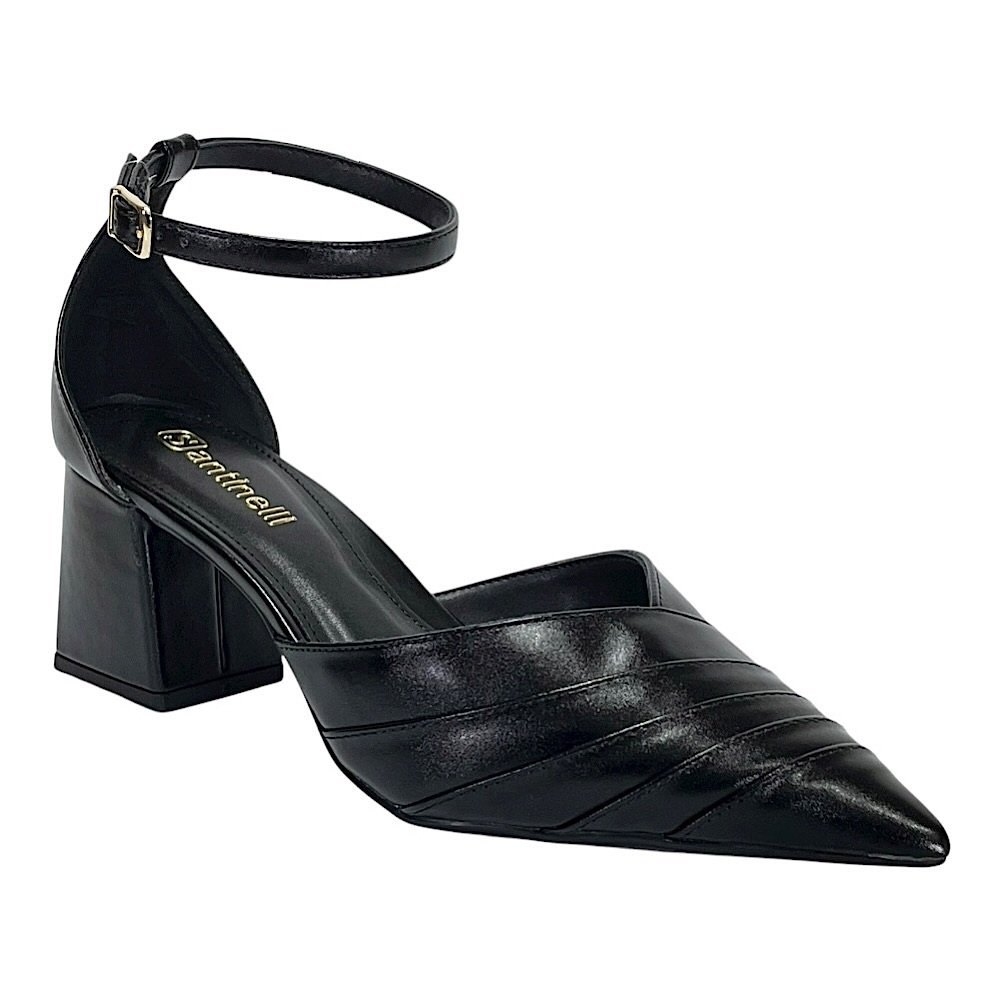 Clássico e versátil, o scarpin Santinelli preto combina design atemporal com detalhes de impacto. O bico fino alonga a silhueta e o cabedal com tiras diagonais sobrepostas confere um acabamento elegante. Feito em material sintético de alta qualidade, possui tira com fivela no tornozelo para ajuste preciso. O salto bloco de 5,0 centímetros garante estabilidade, enquanto a palmilha macia e o solado com boa aderência entregam conforto no uso diário.