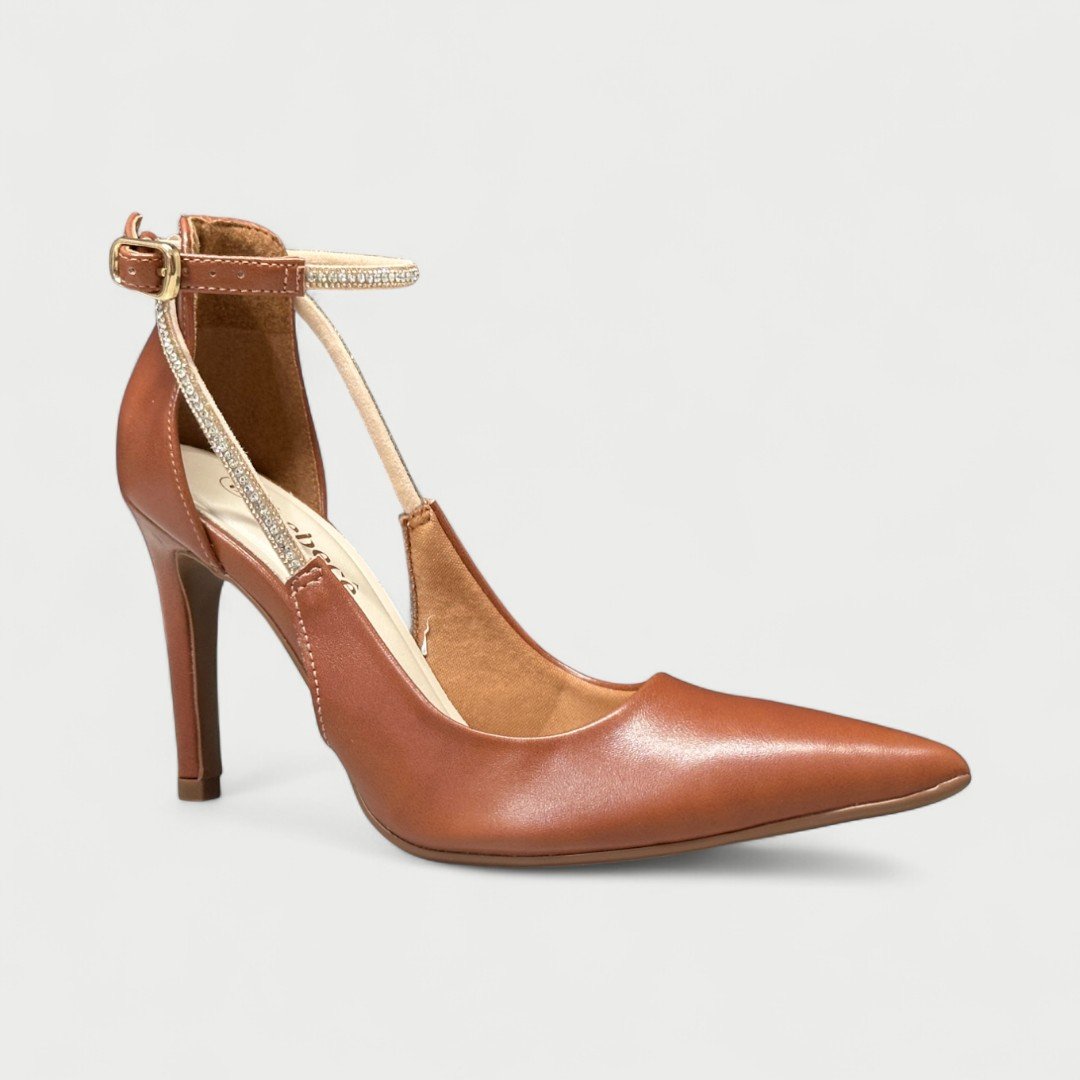 Detalhes: bico fino, fechamento em fivela e tira com strass no tornozelo, conferindo segurança e charme ao caminhar.