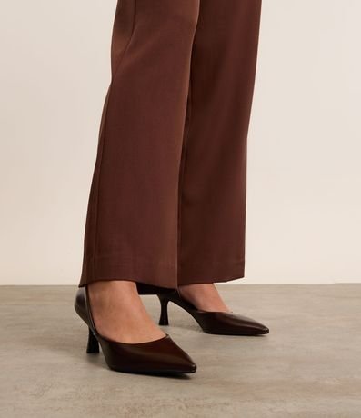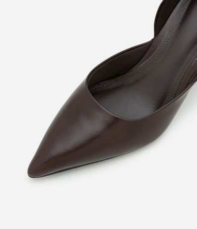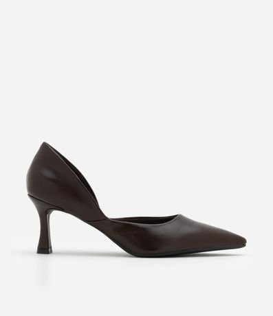 Ref: Scarpin de salto flare alto, confeccionado em material sintético e com bico fino. Sem estampa, possui textura lisa e detalhe de recorte na lateral.