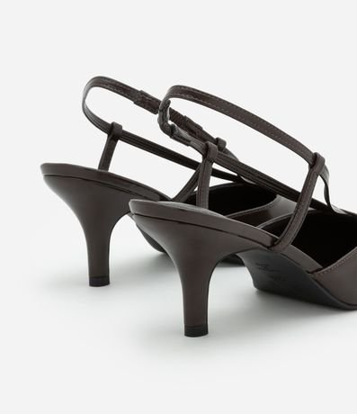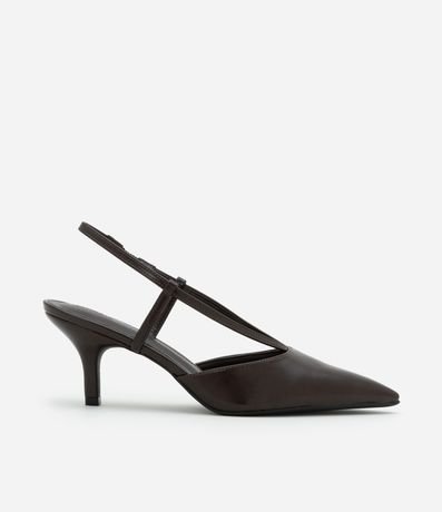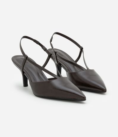 Ref: Sapato scarpin feminino confeccionado em PU com tiras em formato V, com fivela de fechamento e bico fino.
