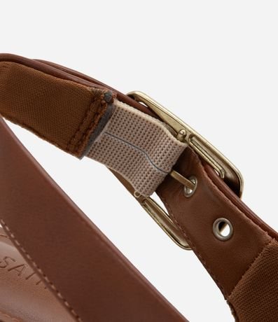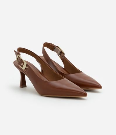 Ref: Sapato feminino confeccionado em material sintético, no modelo Scarpin Slingback contém bico fino, tira média com maxi fivela lateral e salto fino alto.