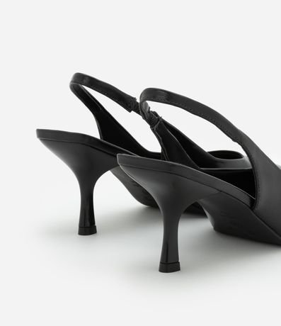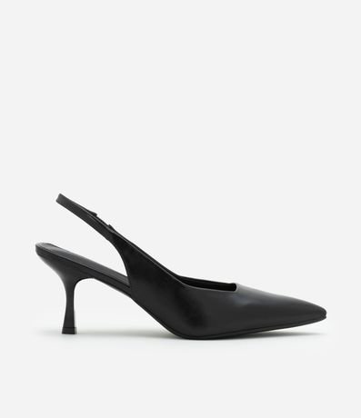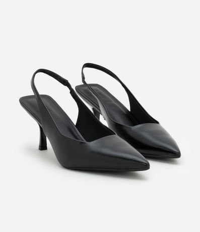 Ref: Scarpin modelo slingback com tira elástica, bico fino, efeito brilhoso e salto fino médio.