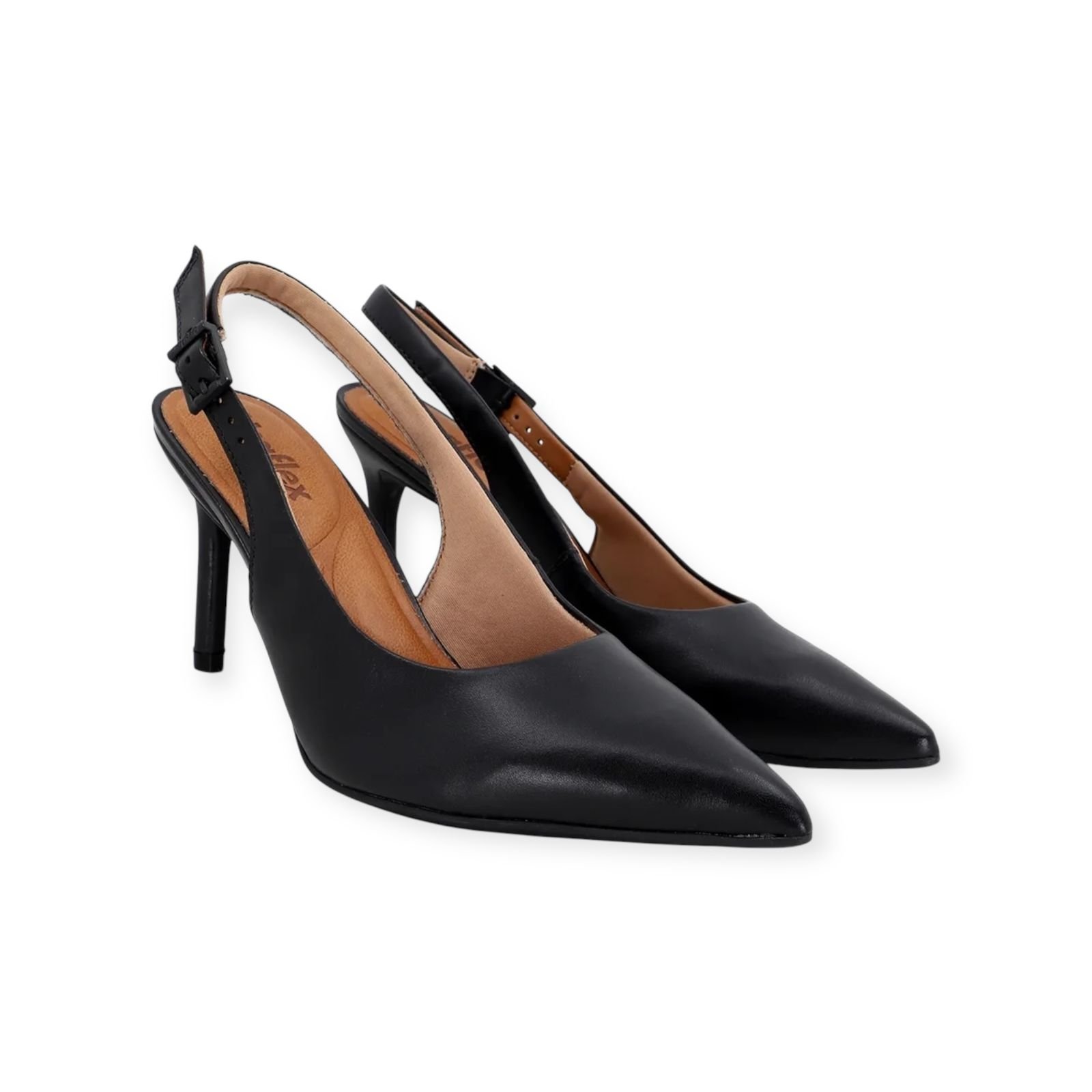 Ref: Sling back em couro na cor preto. Possui bico fino, salto medio fino e fechamento em fivela. Esse modelo de scarpin é ideal para ocasiões que exigem um toque de sofisticação, mas também onde o conforto é necessário, como no ambiente de trabalho ou eventos formais. O modelo possui tecnologia +Bem-Estar, com espumas posicionadas em pontos estratégicos na palmilha garantindo conforto e suavidade na pisada.