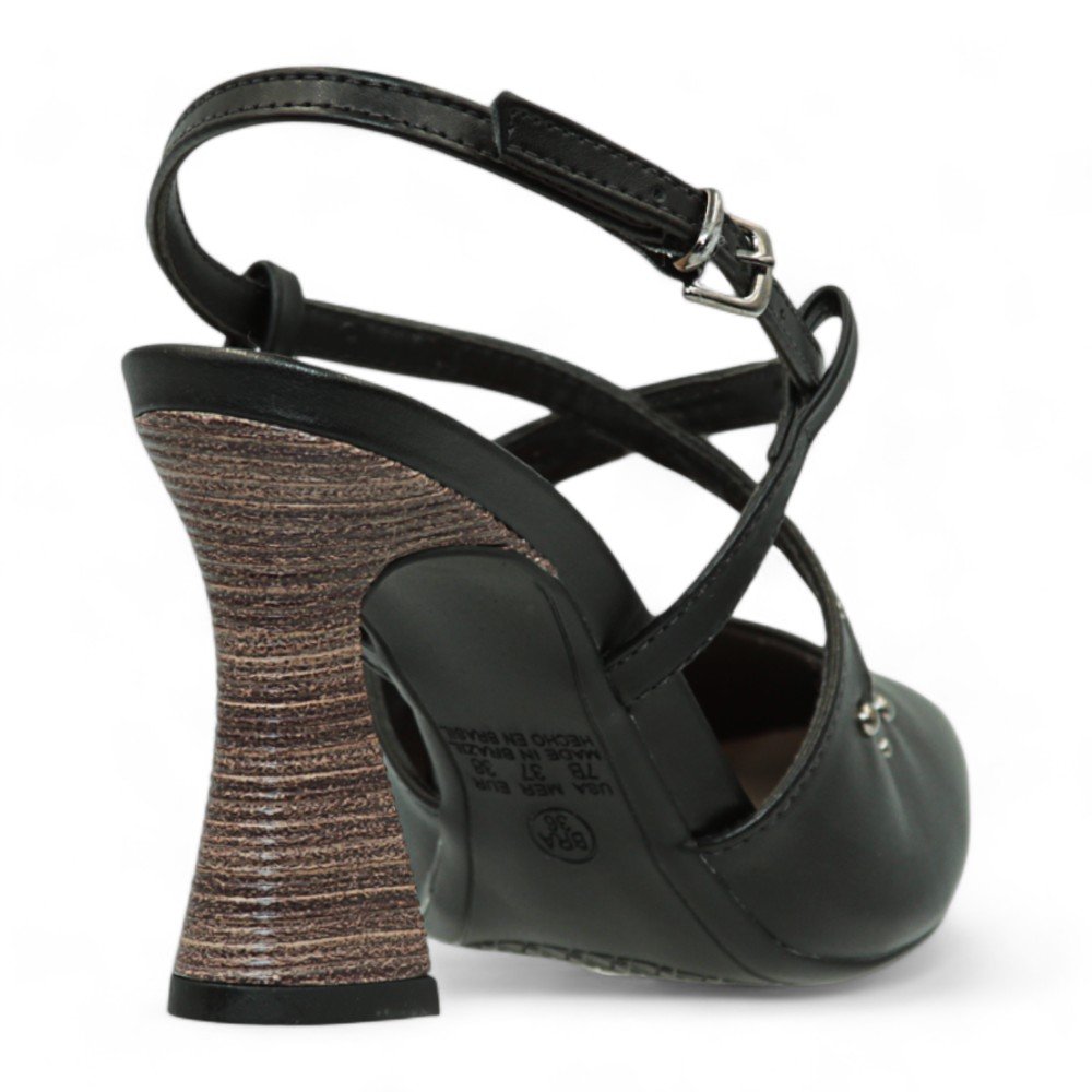 O destaque fica por conta do salto flare, que além de estiloso, garante mais estabilidade ao caminhar. Seu acabamento amadeirado adiciona um charme especial, perfeito para quem gosta de detalhes que fazem a diferença.