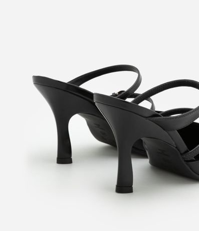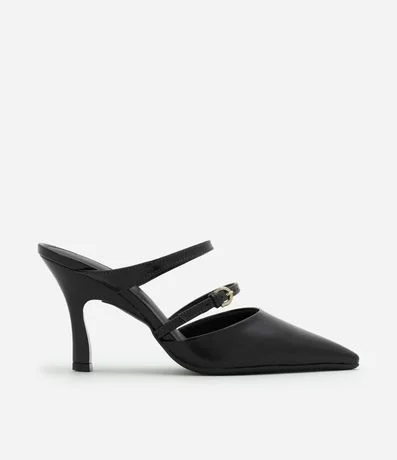 Ref: Scarpin feminino no modelo mule com bico fico, salto alto, tiras duplas finas com detalhe de fivela.