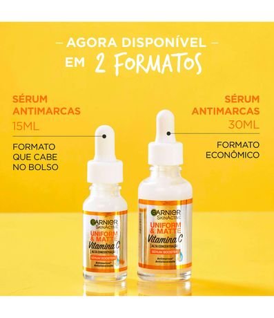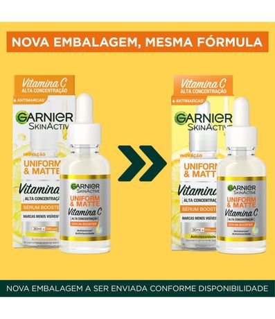 Ref: O novo Garnier Uniform & Matte Sérum Booster tem Alta Concentração de Vitamina C, Niacinamida, Ácido Salicílico e Extrato de Limão, que garantem marcas menos visíveis, pele uniformizada e hidratada, sem deixá-la oleosa. A textura sérum garante fácil aplicação, sensação gostosa pós uso e rápida absorção.