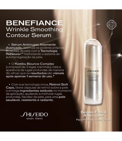 "O tipo de rugas profundas e verticais que se formam ao redor da boca e da testa pode dar a impressão de idade avançada, geralmente prematuramente. É por isso que a SHISEIDO concentrou suas pesquisas mais recentes na diminuição da aparência de rugas profundas de dentro para fora. O Benefiance Wrinkle Smoothing Contour Serum é um sérum altamente avançado que estimula os poderes próprios e naturais da pele. Acelerado pela Tecnologia ReNeura+™ e composto por Retinol Soft Caps e Kombu Bounce Complex (complexo de 3 algas marinhas), o Benefiance Wrinkle Smoothing Contour Serum trata a aparência de rugas profundas de maneira tão eficaz que os resultados são visíveis após apenas 7 dias de uso. **