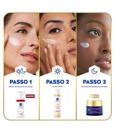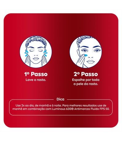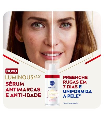 Este sérum tem uma fórmula poderosa que atua na redução de marcas escurecidas da pele, apresentando resultados visíveis em duas semanas*. Com ácido hialurônico, NIVEA Luminous 630® Anti-idade preenche profundamente as rugas em 7 dias. Além disso, estimula a produção de colágeno, ajudando na recuperação de volume e firmeza da pele. Este sérum conta também com Luminous 630®, um ingrediente que atua em nível celular e que é resultado de pesquisas minuciosas realizadas durante 10 anos. Seu efeito antimarcas é comprovado em todos os tons de pele, deixando-as uniformes e iluminadas. *Teste de percepção.