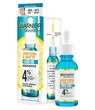 Com 4% de concentração de ativos poderosos [Vitamina C + Ácido Salicílico + Niacinamida + AHA] para combater a acne e reduzir marcas ao mesmo tempo.