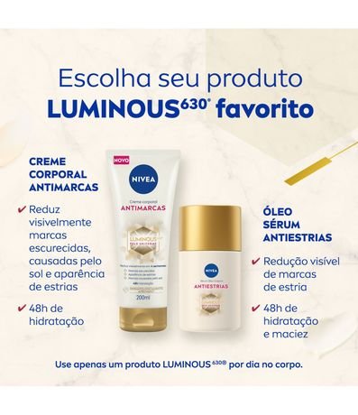 NIVEA LUMINOUS 630® Sérum Óleo Corporal Antiestrias 100 ml é um óleo corporal que promove 48 horas de hidratação, além da sensação de maciez nas marcas de estrias, que combinado com o ativo LUMINOUS 630®, reduz visivelmente marcas de estrias causadas por gravidez, alterações hormonais e alterações de peso, e marcas de sol. Compatível com todos os tipos de pele, o creme foi clinicamente testado e aprovado.