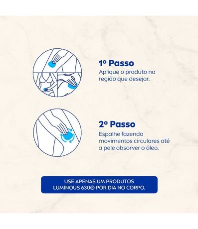 NIVEA LUMINOUS 630® Sérum Óleo Corporal Antiestrias 100 ml é um óleo que age por 48 horas na pele enquanto combate marcas escurecidas, estrias e marcas de sol, deixando o tom uniforme em 2 semanas de uso*, agindo desde o primeiro dia de aplicação. Seu uso contínuo previne o surgimento de novas marcas.