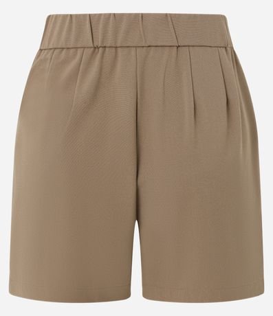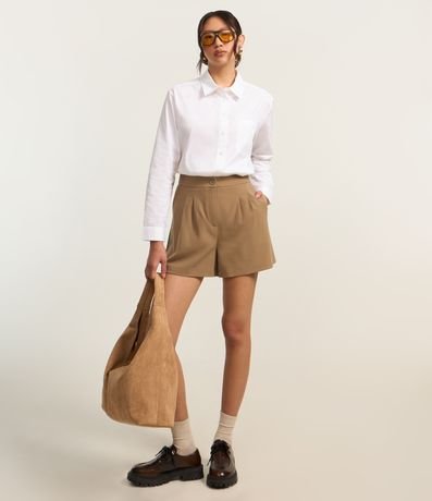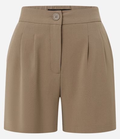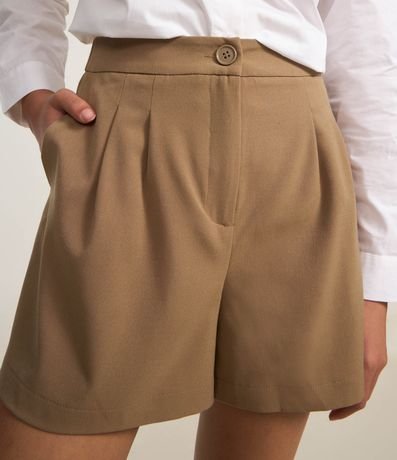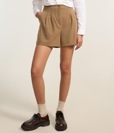 Short confeccionado em poliéster e viscose, com corte alfaiatado e pregas frontais. A peça conta com fechamento frontal tradicional com botão e zíper.