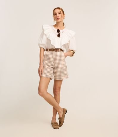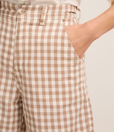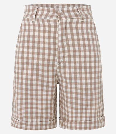 Short feminino confeccionado em sarja alfaiatada, de cintura alta, com barra dobrada e estampa xadrez vichy.