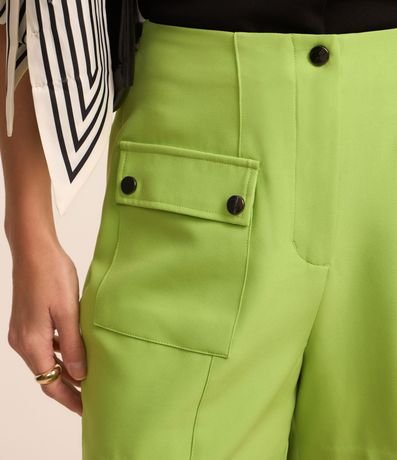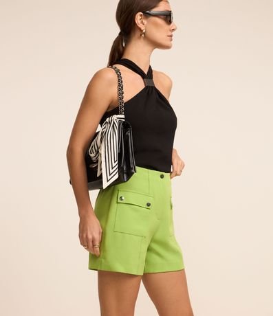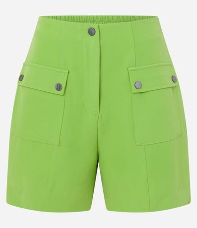 Ref: Short reto alfaiatada de cintura alta com bolsos frontais em estilo que remetem a bolsos cargo com lapelas e botões. Possui eslástico dianteiro no cós,