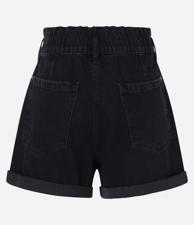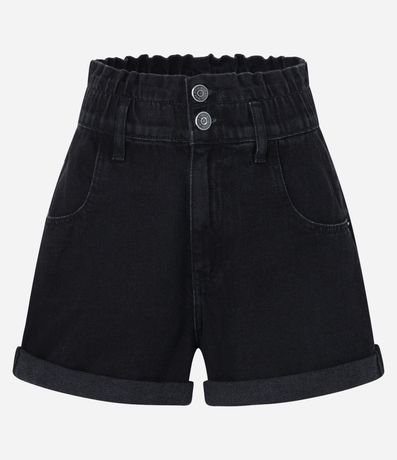 Ref: Short baggy de cintura alta confeccionado em jeans com cós duplo, passantes e elástico na cintura, botões duplos e zíper para fechamento e barras dobradas.