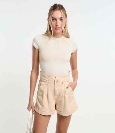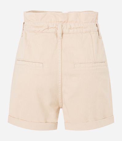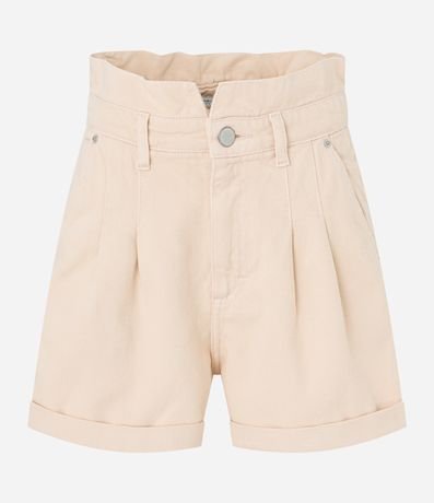 Ref: Short baggy de cintura alta confeccionado em sarja com cós franzido com passantes, fechamento tradicional por botão e zíperl, pregas e barras dobradas.
