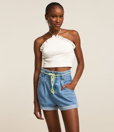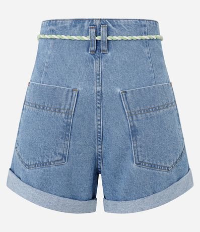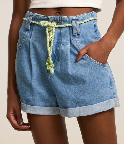 Ref: Short baggy confeccionada em jeans, bolsos frente e costas, cinto de cordão no cós e com barra dobradinha.