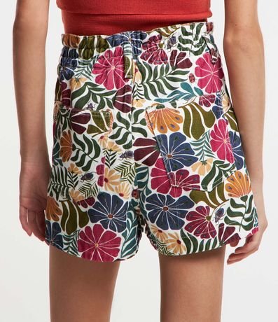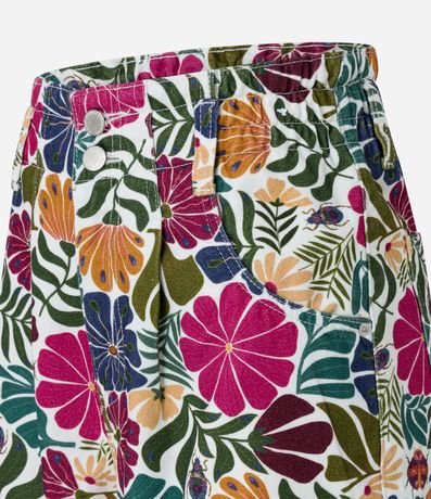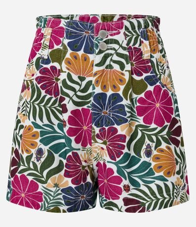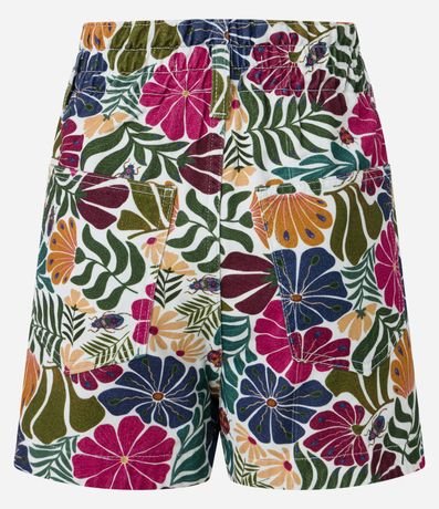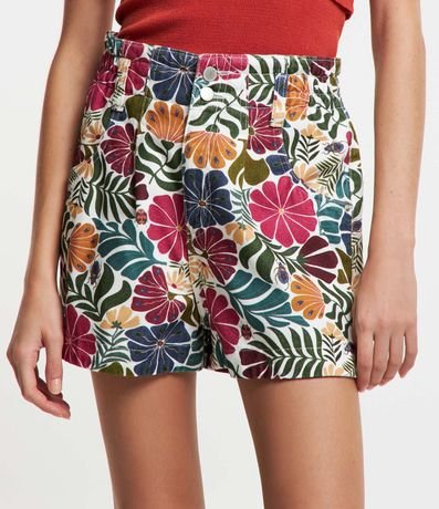 Ref: Shory baggy em sarja com elásticos e passantes no cós, fechamento por botões e zíper, bolsos e flores coloridas estampadas.