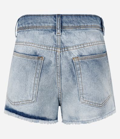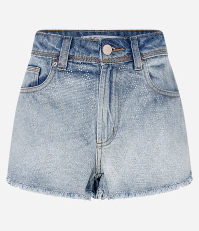 Short jeans feminino modelo boyfriend, com cintura média, cós com passantes, efeito estonado, barra desfiadinha e brilhos aplicadas na frente.