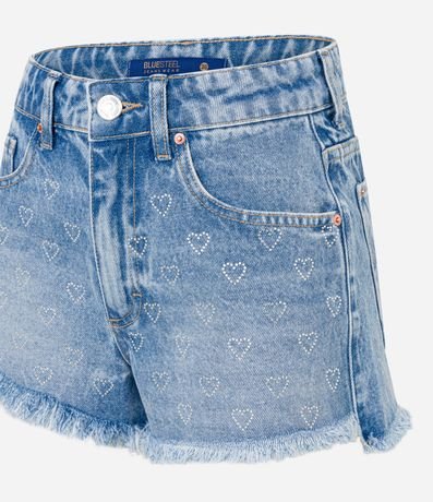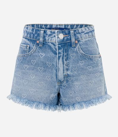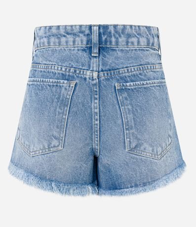 Ref: Short de cintura alta confeccionado em jeans com passantes na cintura, fechamento tradicional por botão e zíper, bolsos e barra cortada com franjinhas.