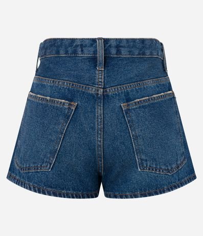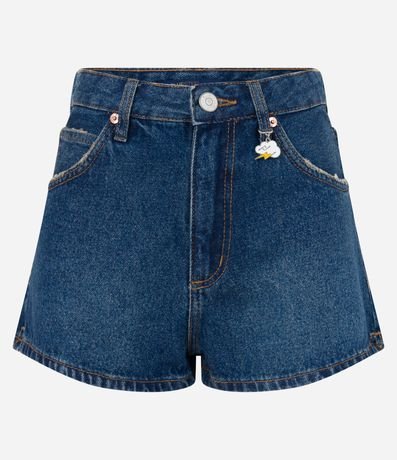 Ref: Short em jeans com passantes no cós, cintura alta, pingentinho de nuvem e bolsos. Conta com pingentinho de nuvem aplicado no passante.