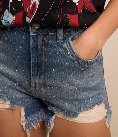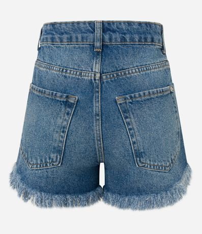 Ref: Short de cintura alta confeccionado em jeans com passantes na cintura, fechamento tradicional por botão e zíper além de bolsos frontais e traseiros, rasgos e puídos mais barra desfeita com franjinhas desfiadas.