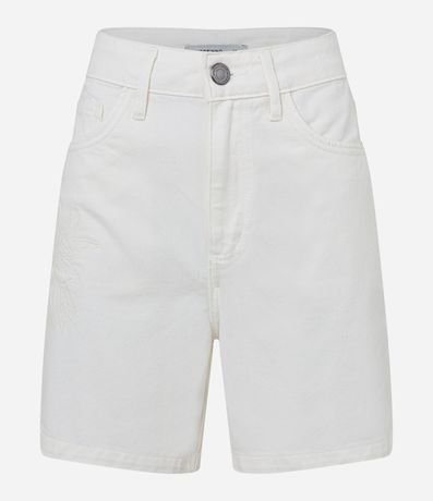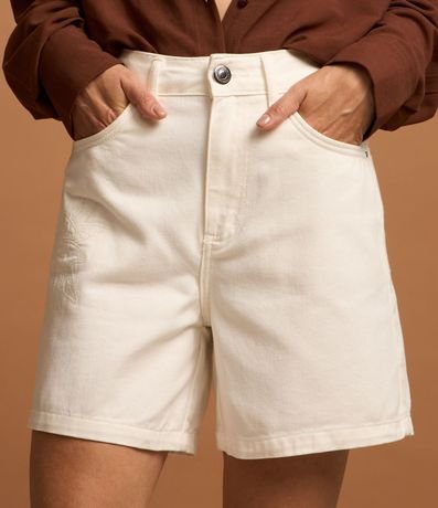Ref: Shor feminino confeccionado em sarja mais sustentável, cintura alta, cós com passante, bolsos com aplicação e detalhe em bordado de flor.