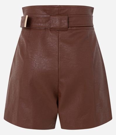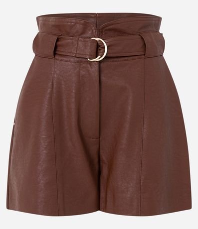 Short clochard em material sintético com cintura alta, cinto e fivela metálica.