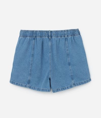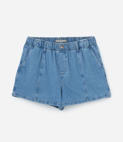 Ref: Short jeans plus size, modelo clochard, com cintura elástica, bolsos faca e recortes verticais.