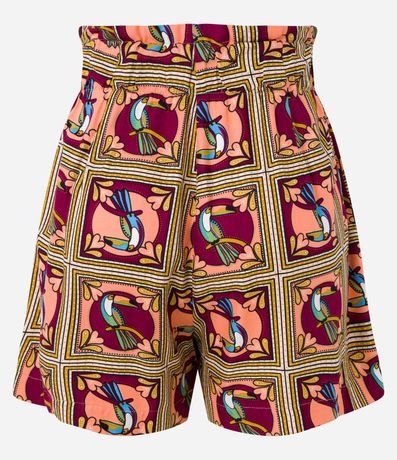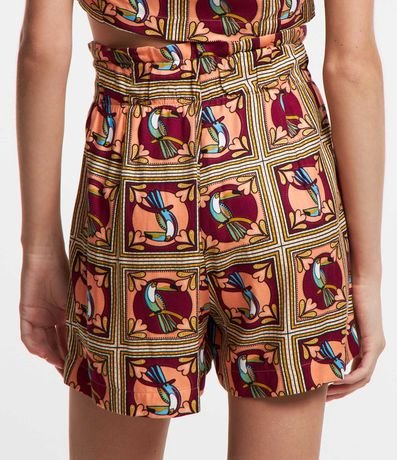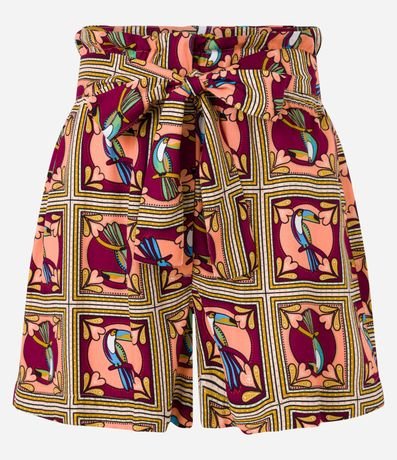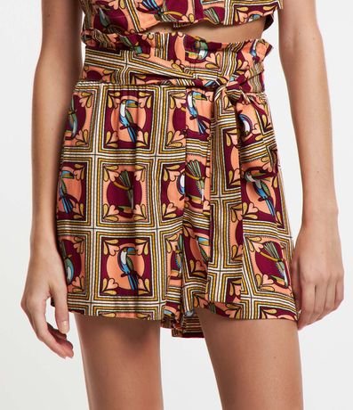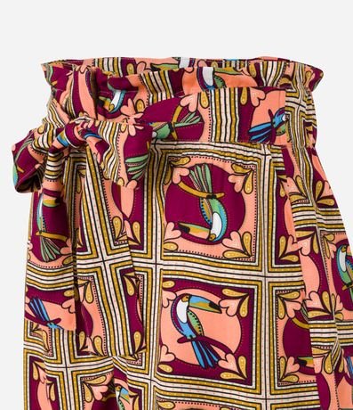 Ref: Short clochard, confeccionado em viscose, cós com cinto estilo lenço e estampa de tucanos.